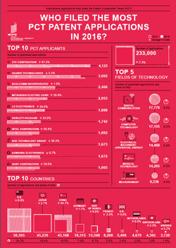 过去一年,WIPO专利、商标和工业品外观设计知识产权申请服务的需求依然强劲,中国的中兴通讯股份有限公司超过了其同城的竞争对手华为技术公司,成为2016年WIPO国际专利申请的最大申请人,美国的高通公司名列第三。