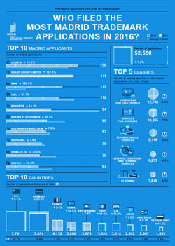 2016年,美国的申请人(7,741件)使用WIPO商标国际注册马德里体系提交的国际商标申请量最大,紧跟其后的是德国(7,551件)、法国(4,132件)、中国(3,200件)和瑞士(3,074件)。中国、土耳其(1,221件,排第12位)和俄罗斯联邦(1,176件,第13位)是前15名中仅有的三个中等收入国家.