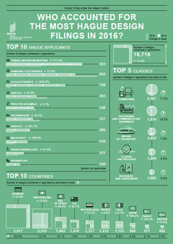 2016年,通过WIPO工业品外观设计国际注册海牙体系提交的国际工业品外观设计申请增长了35.3%。这些申请中所含的外观设计数增加了13.9%。2016年提交的5,562份申请中包含了18,716项外观设计。