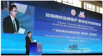 广西壮族自治区副主席黄日波在演讲中说,2017中国国际商标品牌在广西成功举办,有助于推进广西商标品牌战略实施。广西高度重视商标品牌工作,全区有效注册商标总量达4.34万,马德里国际注册商标118件。他说,共享品牌,创业创新,广西有自己独特的优势。2014年以来中国东盟博览会已成功举办3届,广西积极建设中国东盟品牌创新创业基地,吸引全国、东盟各国知名品牌入驻。广西将努力为企业提供高效便捷的政务环境,支持企业开展商标品牌运作。