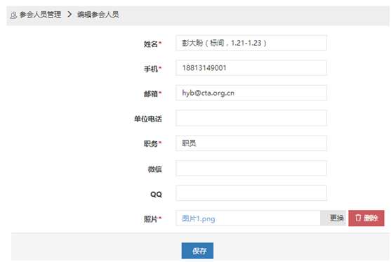 1.点击左侧菜单栏参会人员管理——添加——填写报名信息(姓名、电话、邮箱、职务、照片为必填项);