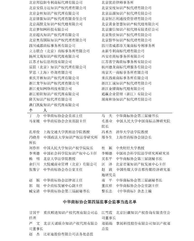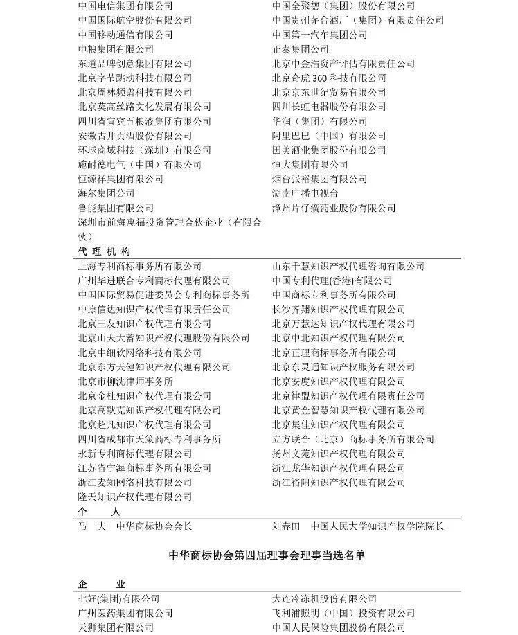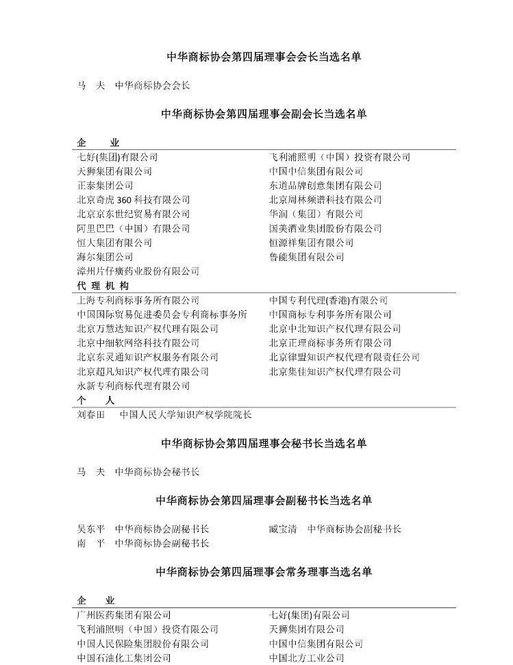 随后召开的第四届理事会第一次全体会议,选举产生了第四届理事会领导机构。马夫当选为第四届理事会会长。选举中国人民大学知识产权学院院长刘春田教授作为个人副会长,选举飞利浦照明(中国)投资有限公司、中国中信集团有限公司、 阿里巴巴(中国)有限公司、恒大集团有限公司、中国国际贸易促进委员会专利商标事务所、中国专利代理(香港)有限公司等30家单位为副会长单位。选举吴东平、臧宝清、南平为中华商标协会副秘书长。选举中国石油化工集团公司、广州医药集团有限公司、施耐德电气(中国)有限公司、北京三友知识产权代理有限公司、北京金杜知识产权代理有限公司等72 家单位为常务理事单位。 选举中国旅游集团公司、中国北京同仁堂(集团)有限责任公司、内蒙古伊利实业集团股份有限公司、苏宁云商集团股份有限公司、金利来(中国)有限公司、北京天驰君泰律师事务所、广东永华知识产权管理有限公司等 129 家单位为理事单位;选举李顺德、毛基业、孔祥俊、杜颖等24人为个人理事。选举甘国平、江雪霞、严文、郑娟娟、赵杰为监事会监事。