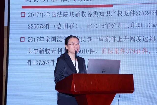 最高人民法院知识产权庭郎贵梅法官结合2017年商标案件审理总体情况,分析了2017年商标案件特点和难点,介绍了最高人民法院商标案件的审判工作。并与大家分享了她对一些问题的思考。对于如何做好商标案件审理工作,她认为,一是要慎重审理疑难复杂案件,尤其是双方此前有长期复杂合作关系的案件,保护诚信经营,确保好品牌不因案件审理结果而受到影响,发挥司法的润滑剂作用;二是把握商标法的核心即“混淆可能性”的判断,运用商标法第30条和第57条,审理好商标行政案件和侵权案件, 运用多因素检验法,而非商标近似和商品类似的机械对比。