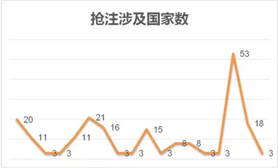 在105家商标有被抢注记录的知名企业中,平均每家企业在4.3个国家有抢注;其中,被抢注涉及国家最多的为维沃移动通信有限公司,在包括美国、巴西、欧盟等53个国家/地区有被抢注记录;其次为湖南中烟工业有限责任公司,在巴拿马、俄罗斯、印度尼西亚等21个国家/地区有被抢注记录;再次为北汽福田汽车股份有限公司,在非洲知识产权组织、委内瑞拉、西班牙等20个国家/地区有被抢注记录。此外,还有6家企业商标在10个以上国家/地区有被抢注的记录。