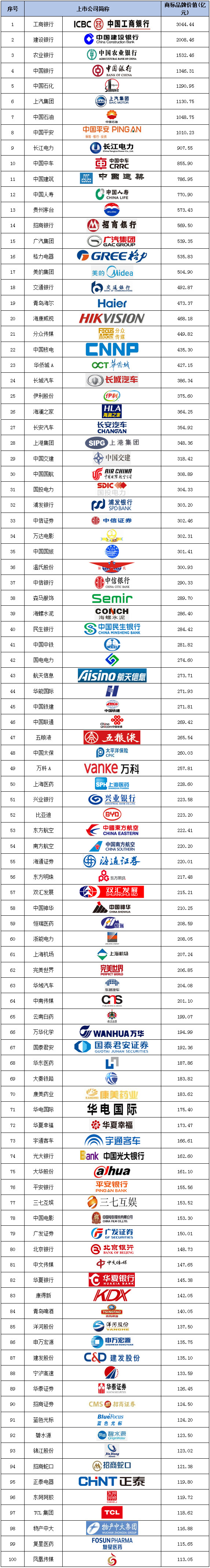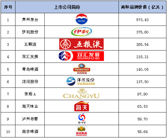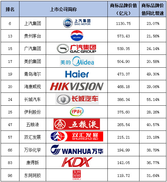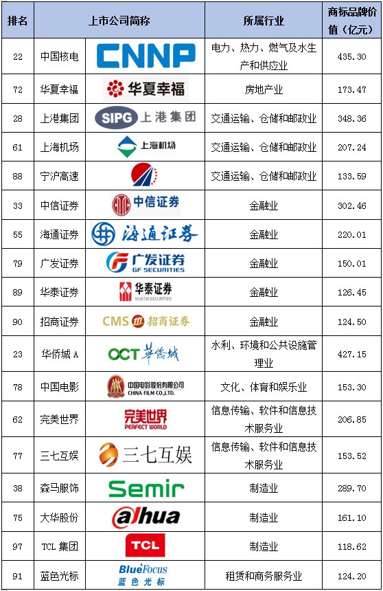2017沪深上市公司商标品牌价值排行榜