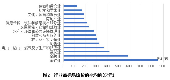 具体而言,采矿业、金融业与建筑业上榜企业的平均商标品牌价值额分列前三。