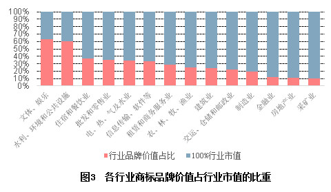 文化、体育和娱乐业、水利、环境和公共设施业以及住宿与餐饮业等与消费者日常生活相关度较高的行业,其品牌价值占市值的比重明显较高。