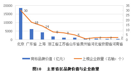 在地域分布方面,“百强”企业来自全国20个省、自治区和直辖市,其中北京、广东和上海的上榜企业数量、商标品牌价值总额皆位居前三。