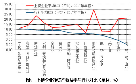 分析上榜企业的经营业绩,各上榜行业企业的平均净资产收益率(ROE)均高于行业上市公司平均水平。行业平均ROE越低的行业,其上榜企业ROE超过行业平均水平越多,如租赁和商务服务业、制造业和农、林、牧、渔业等。