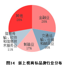 在26个价值明显增长的商标品牌中,13家是制造业企业、8家是金融业企业。其中4家制造业企业主营食品、奶制品、酒类,而8家金融业上榜企业有7家为银行。