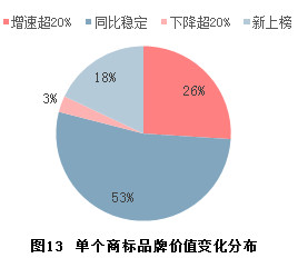 商标品牌价值同比正增长的企业占64%,其中26个企业的商标品牌价值增长幅度超20%。