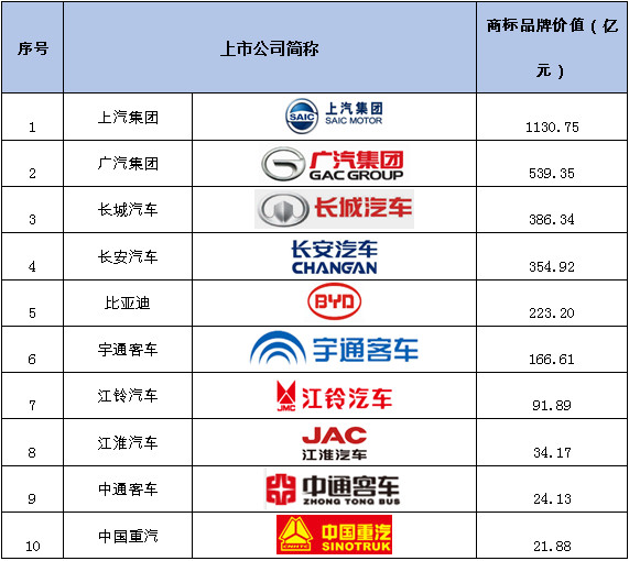表1 2017年汽车整车制造行业商标品牌价值排行
