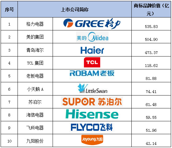 表1 2017年家用电器行业商标品牌价值排行