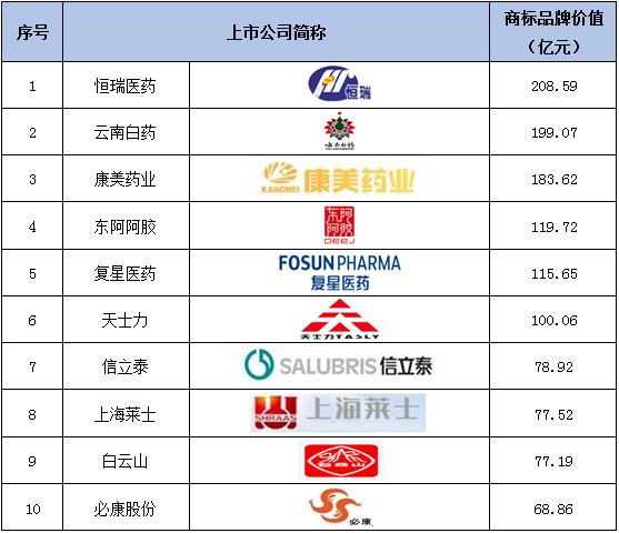 表1 2017年医药制造行业商标品牌价值排行