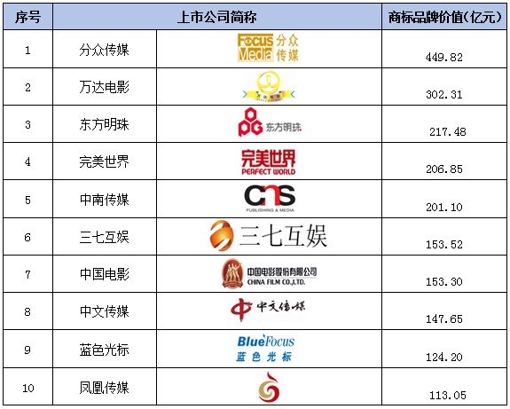 表1 2017年文化传媒上市公司商标品牌价值排行