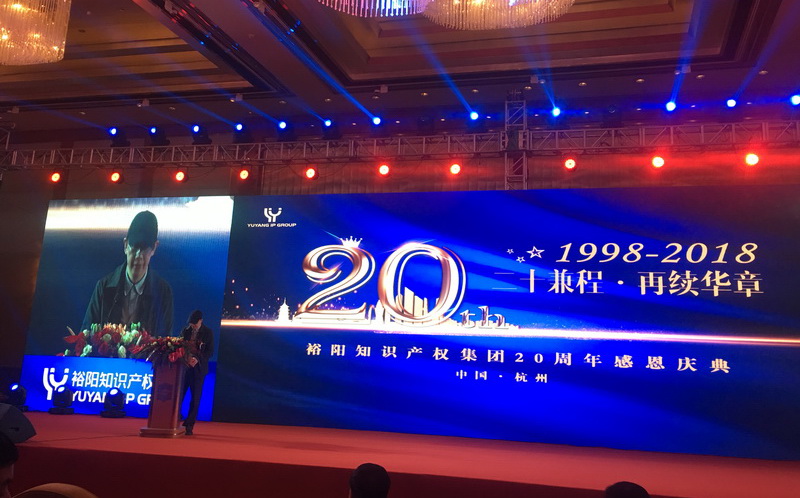 2018年12月16日,裕阳知识产权集团成立20周年纪念活动在杭州市举办,中华商标协会副秘书长南平出席会议并致贺辞。来自浙江省商标协会、杭州市商标协会、中国计量大学法学院的领导及企业、同行代表近400人出席会议。