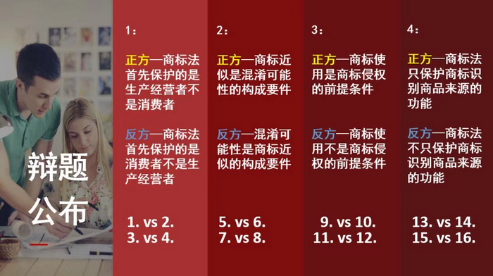 随后,在抽签环节中,主持人汪泽介绍了抽签分组的规则和流程。抽签工作分为两项,一是抽取比赛对阵分组,二是抽取首轮比赛的题目顺序。本届比赛将通过淘汰赛的方式,最终决出冠亚军,初赛通过抽签的方式确定分组。在对阵分组环节,马夫和白刚分别抽取了比赛的正方和反方,对阵结果如下: