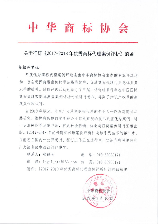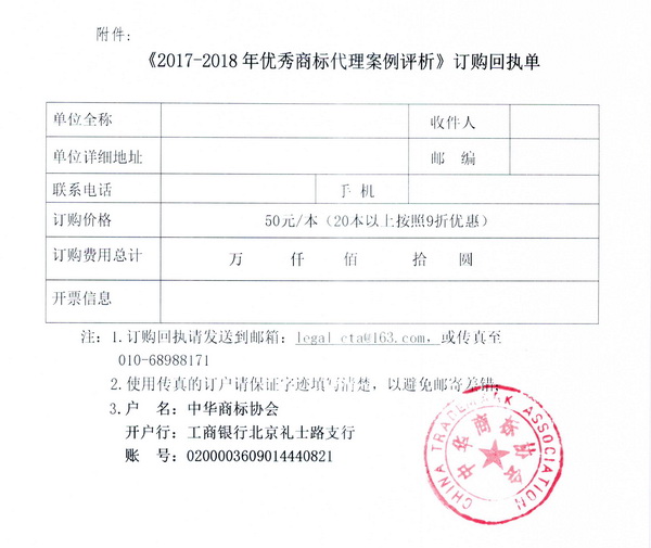 关于征订《2017-2018年优秀商标代理案例评析》的函