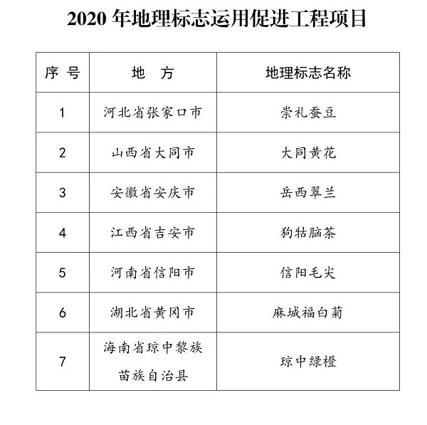 按照《国家知识产权局办公室关于组织推荐2020年地理标志运用促进工程项目申报的通知》(国知办函运字〔2020〕331号)要求,经各地自愿申报、省级知识产权局遴选推荐、专家评审论证,确定2020年地理标志运用促进工程项目,现将名单予以公示(详见附件),公示期为3个工作日(2020年6月9日至2020年6月11日)。