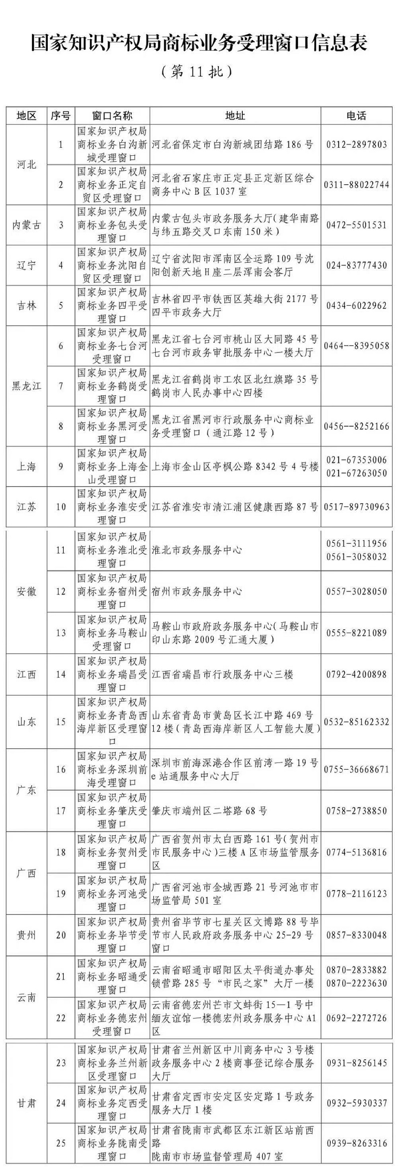 附件:国家知识产权局第11批商标业务受理窗口名单
