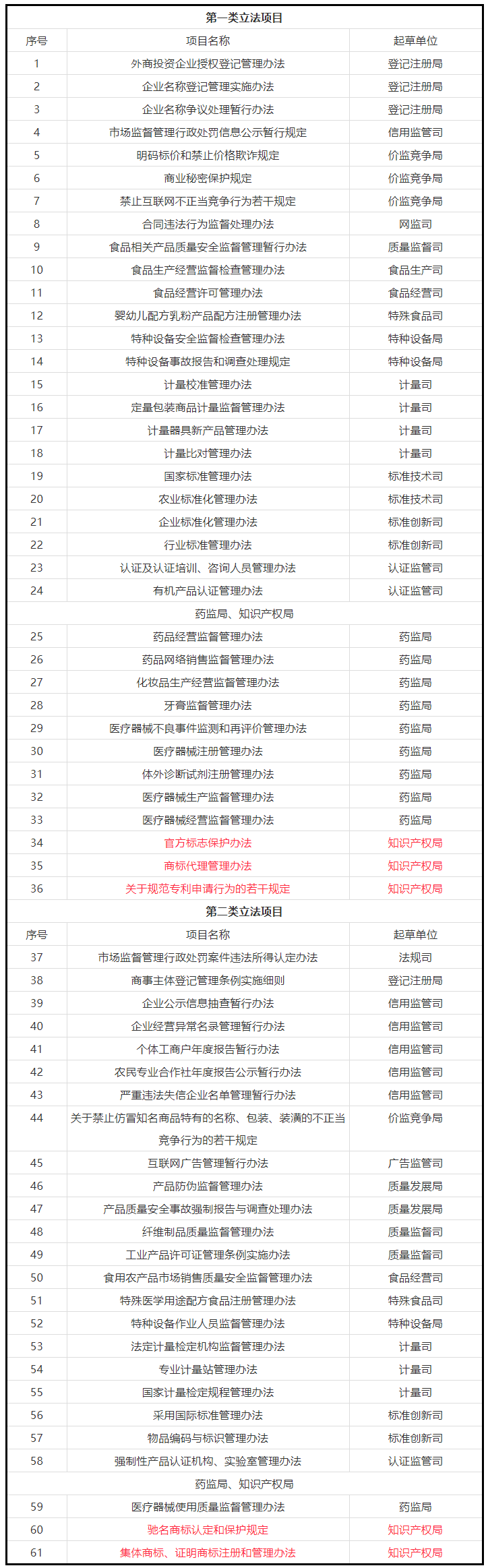 (二)拟制修订部门规章61部:一是为加强和改进反垄断和反不正当竞争执法,切实维护市场公平竞争,修订商业秘密保护规定、制定禁止互联网不正当竞争行为若干规定等规章。二是为加强食品安全综合治理,强化药品安全全程监管,提高特种设备安全监管隐患排查治理能力,着力防范重点工业产品质量安全风险,修订食品生产经营监督检查管理办法、药品经营监督管理办法、特种设备安全监督检查管理办法等规章。三是为深化市场准入制度改革,规范市场秩序,加强知识产权保护,健全完善市场监管制度规则,修订企业名称登记管理实施办法、合同违法行为监督处理办法、关于规范专利申请行为的若干规定等规章。四是为持续推进质量强国战略实施,推动产品和服务质量提升,修订计量校准管理办法、国家标准管理办法、企业标准化管理办法、有机产品认证管理办法等规章。