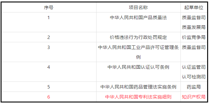 (一)拟起草法律、行政法规送审稿6部:产品质量法、价格违法行为行政处罚规定、工业产品许可证管理条例、认证认可条例、药品管理法实施条例、专利法实施细则。