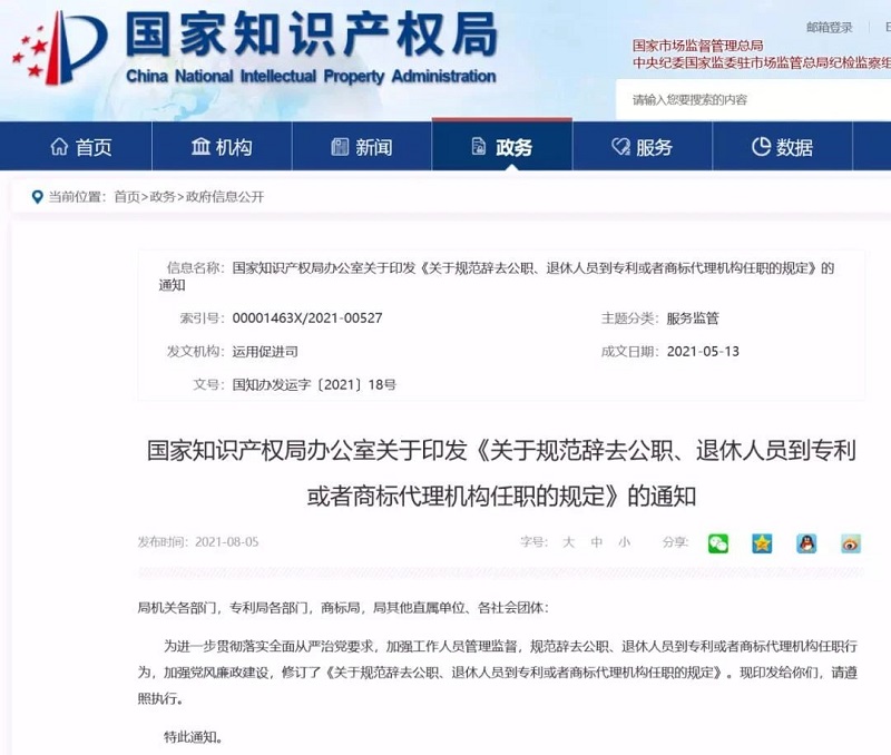 国家知识产权局办公室关于印发《关于规范辞去公职、退休人员到专利或者商标代理机构任职的规定》的通知