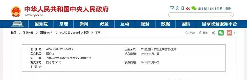 《中华人民共和国市场主体登记管理条例》已经2021年4月14日国务院第131次常务会议通过,现予公布,自2022年3月1日起施行。