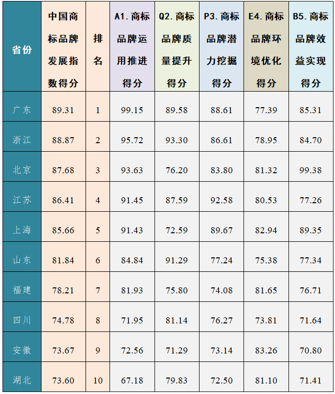 为贯彻落实《知识产权强国建设纲要(2021-2035年)》关于推进商标品牌建设的工作部署,加快打造品牌经济,推动实现高质量发展,近日,国家知识产权局运用促进司指导中华商标协会编制发布“中国商标品牌发展指数(2021)”,对2020年全国各省(自治区、直辖市)商标品牌发展综合水平进行指数测评。广东以89.31分位居全国第一,第二至五位分别为浙江(88.87)、北京(87.68)、江苏(86.41)、上海(85.66)。