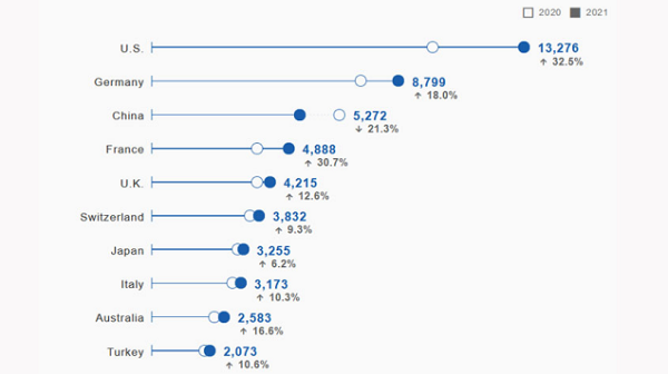 2021 年,美国申请人提交的国际商标申请数量最多(总计13,276 件),同比2020年增长 32.5%。