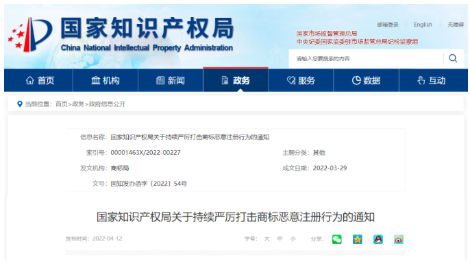 风清气正的商标注册管理秩序是推动知识产权事业高质量发展、营造良好创新环境和营商环境的重要基础。全国知识产权系统认真贯彻习近平总书记关于知识产权工作的重要指示论述,始终保持严厉打击商标恶意注册的高压态势,集中开展打击商标恶意抢注专项行动,常态化打击商标恶意囤积行为,取得明显成效。为进一步落实2022年全国知识产权局局长会议部署,以“零容忍”的态度持续严厉打击商标恶意注册行为,构建部门协同、上下联动、社会共治的工作新格局,保护市场主体合法权益,维护社会公共利益,加速推进我国由知识产权大国向知识产权强国转变,现就有关事项通知如下: