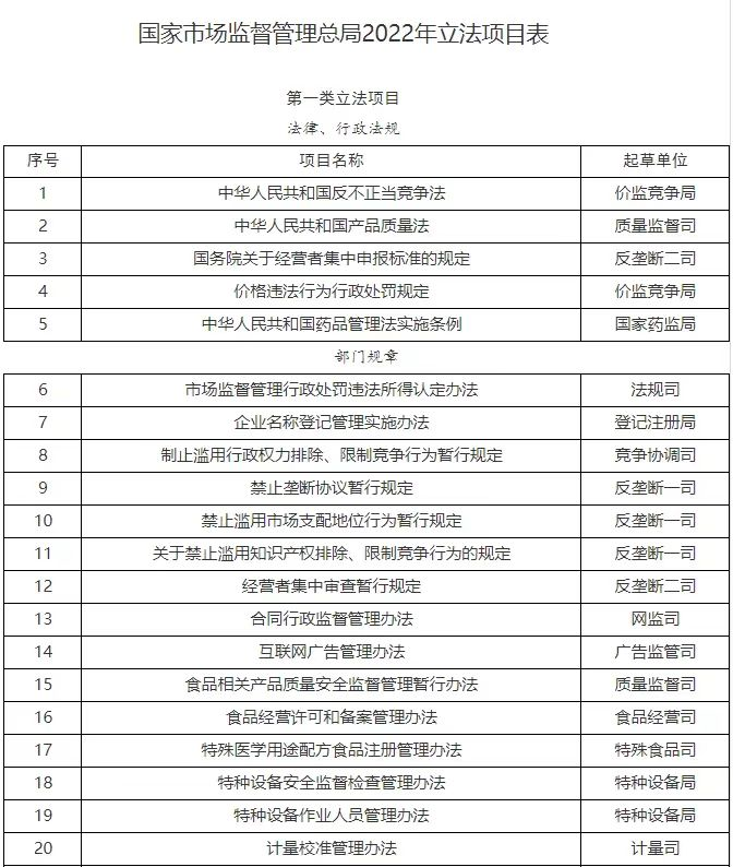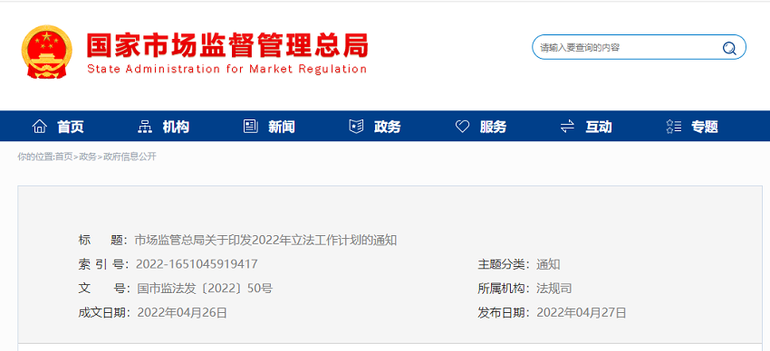 市场监管总局关于印发2022年立法工作计划的通知