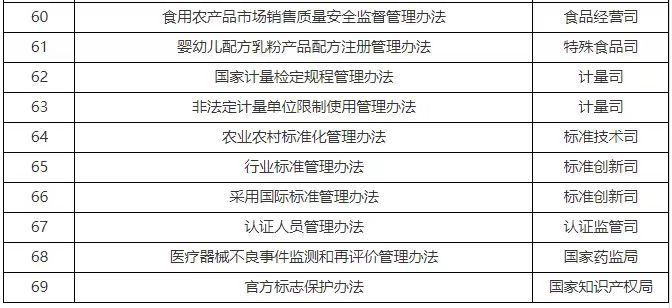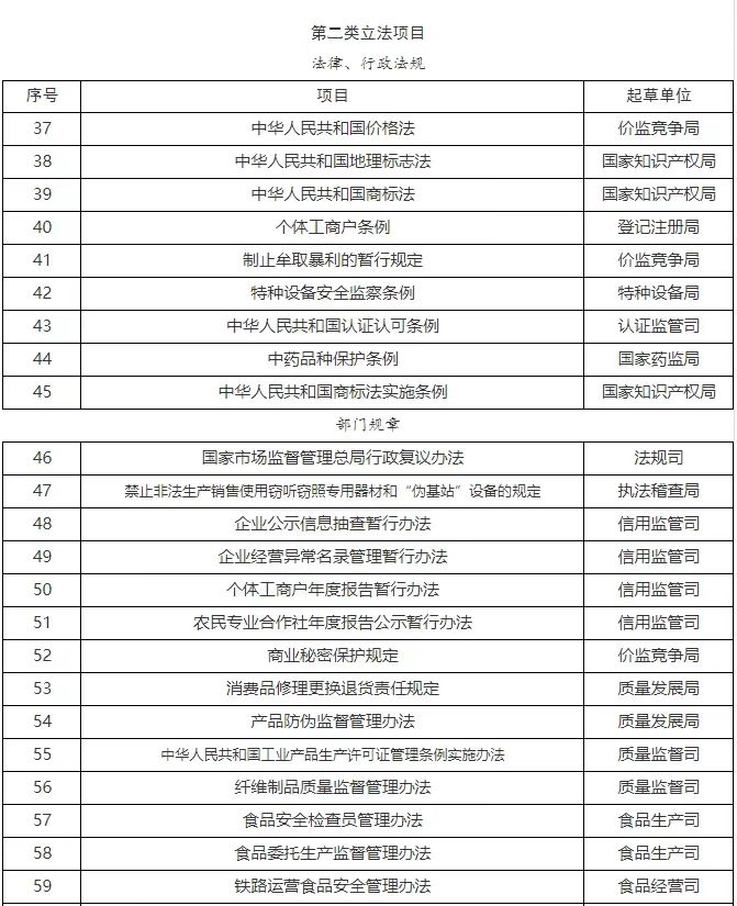 (三)继续积极配合立法机关推进的立法项目:包括反垄断法、计量法、企业信息公示暂行条例、消费者权益保护法实施条例、专利法实施细则、市场监督管理所条例等法律、行政法规。