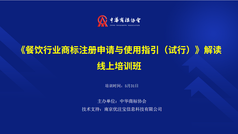 为加强商标从业人员对指引的理解与认识,引导餐饮企业重视商标注册、合理使用与正当保护商标权,提高商标代理机构商标法律理论水平和服务能力,我会拟于5月31日面向社会公众举办指引解读线上培训班。本次培训由南京优注宝信息科技有限公司提供技术支持。具体通知如下: