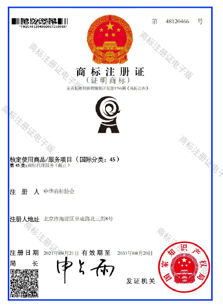为发挥中华商标协会作为商标领域全国性行业社团组织作用,提升代理机构和代理人的服务质量和代理水平,加强商标代理行业诚信体系建设,配合国家知识产权局开展“蓝天”行动,引导商标代理机构自觉遵守有关法律规定及行业纪律要求,中华商标协会向国家知识产权局申请了商标代理服务证明商标。2021年8月21日,国家知识产权局向中华商标协会颁发了第45类,商标代理服务第48120466号证明商标注册证。