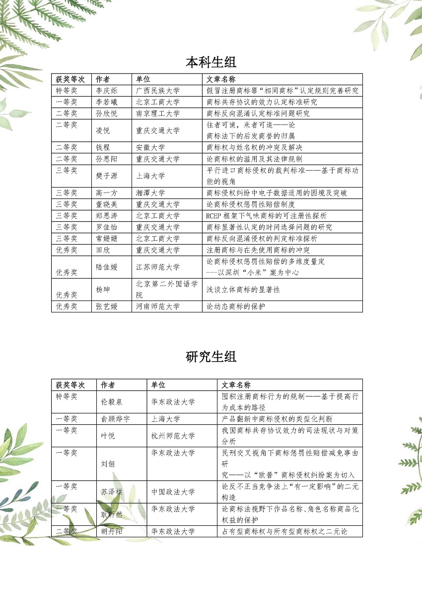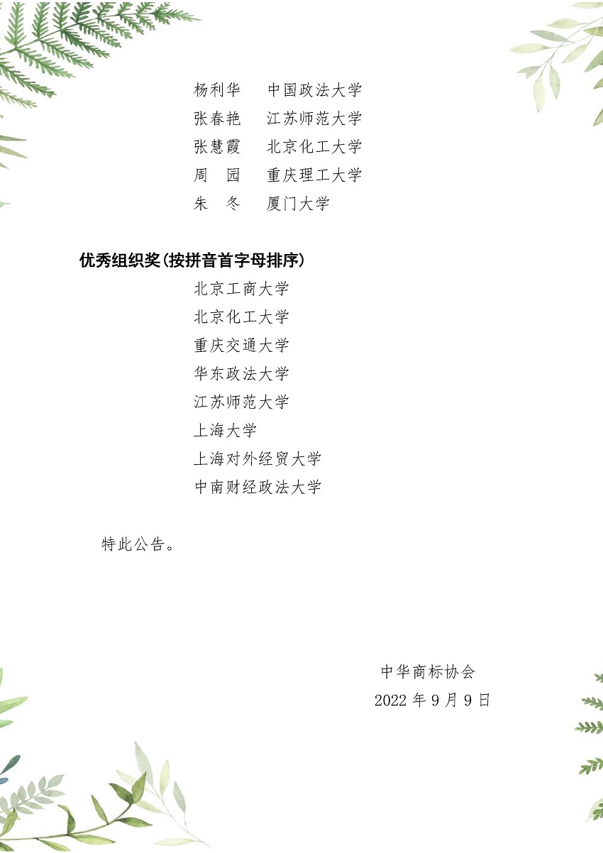 为深入贯彻落实党中央、国务院关于知识产权工作的决策部署,推进以“尊重知识、崇尚创新、诚信守法、公平竞争”为核心的知识产权文化建设,普及商标法律知识,促进知识产权人才培养,加强商标理论与实务的学习和交流,我会举办了“万慧达杯”第二届中华商标协会全国高校商标热点问题征文比赛。经过专家评审,现将获奖名单公告如下: