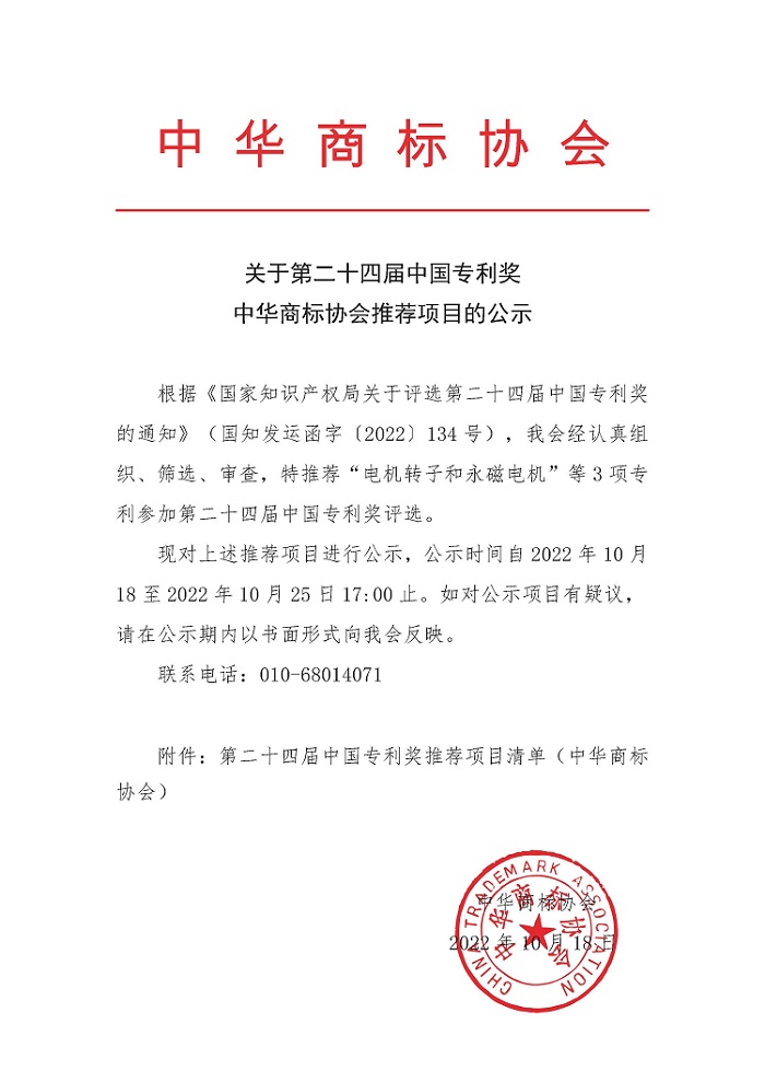 关于第二十四届中国专利奖中华商标协会推荐项目的公示