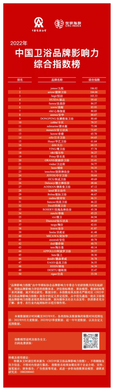本次指数报告遴选入围百余家中国卫浴品牌,对31.36亿条数据进行建模运算,结合业界资深行家、课题组专家意见建议,经多轮评议考证,通过指数呈现出了一批中国卫浴行业颇具影响力的优秀品牌,其中前10名品牌是:jomoo/九牧、arrow/箭牌卫浴、hegii/恒洁、HUIDA/惠达、faenza/法恩莎、ssww/浪鲸、shkl/心海伽蓝、annwa/安华、DONGPENG/东鹏整装卫浴、cobbe/卡贝。