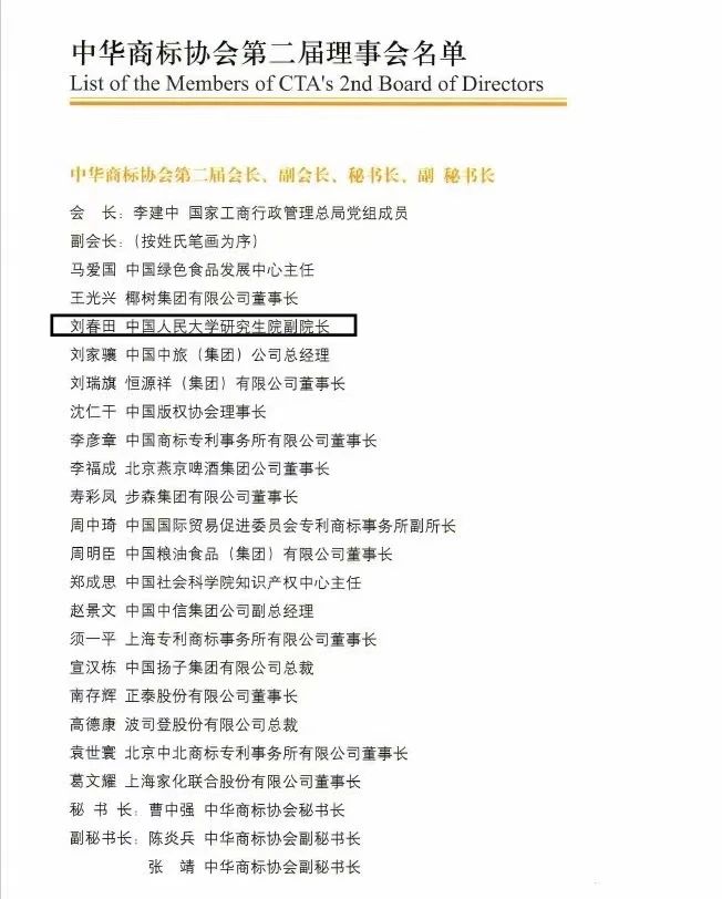刘春田教授在中华商标协会筹建过程中,参与拟就《中华商标协会章程》,1994年9月中华商标协会成立之时,经选举任协会副秘书长,后任协会副会长至今,并任协会《中华商标》杂志编委会副主任,多次参加协会组织的活动,对协会工作给予了大力支持。