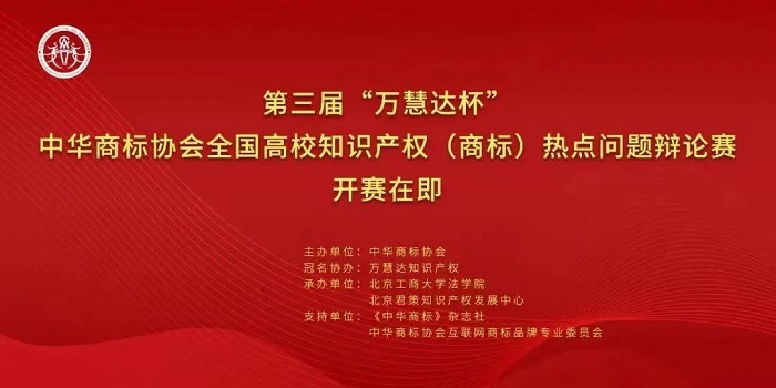 4月1日(本周六),由中华商标协会主办,万慧达知识产权冠名协办,北京工商大学法学院与北京君策知识产权发展中心共同承办的第三届“万慧达杯”中华商标协会全国高校知识产权(商标)热点问题辩论赛即将在北京工商大学阜成路校区隆重开幕。