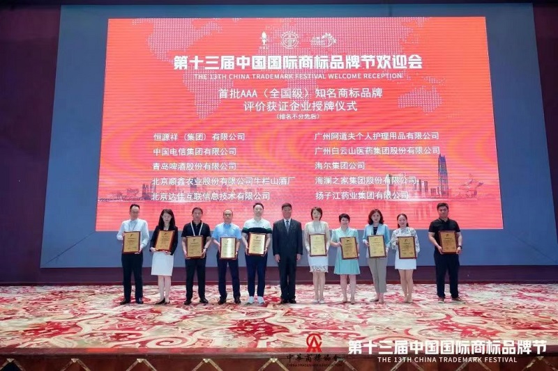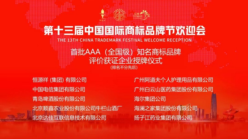 2023年6月15日,Haire(海尔集团公司)、中国电信(中国电信集团有限公司)、牛栏山(北京顺鑫农业股份有限公司牛栏山酒厂)、白云山(广州白云山医药集团股份有限公司)、快手(北京达佳互联信息技术有限公司)、扬子江(扬子江药业集团有限公司)、阿道夫(广州阿道夫个人护理用品有限公司)、青岛啤酒(青岛啤酒股份有限公司)、恒源祥(恒源祥(集团)有限公司)、海澜之家(海澜之家集团股份有限公司)十家企业(以首字笔画顺序排列)的首批AAA级知名商标品牌在第十三届中国国际商标品牌节欢迎晚会上公布并举行授牌仪式。