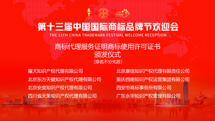 在第十三届中国国际商标品牌节欢迎会上,举行了第三批商标代理服务证明商标使用许可证书颁发仪式,为隆天知识产权代理有限公司、北京康信知识产权代理有限责任公司、北京东方天健知识产权代理有限公司等8家代理组织颁发了商标代理服务证明商标使用许可证书。