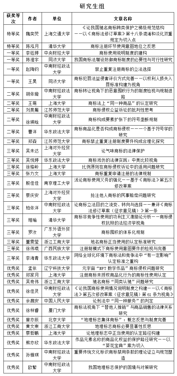 截至收稿日,组委会共收到了来自40所高校的139篇征文,其中本科生组58篇,研究生组81篇,主题涵盖商标恶意注册商标囤积的法律规制以及我国《商标法》第五次修改等多个商标领域热点问题。