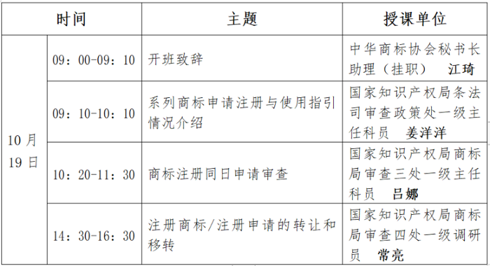 为帮助会员更好地了解两个指引制定背景,加深商标注册同日申请和商标转让程序相关问题的认识,我会拟于10月19日在北京举办商标注册同日申请和商标转让程序指引解读培训班(线上、线下相结合)。现将培训相关安排如下: