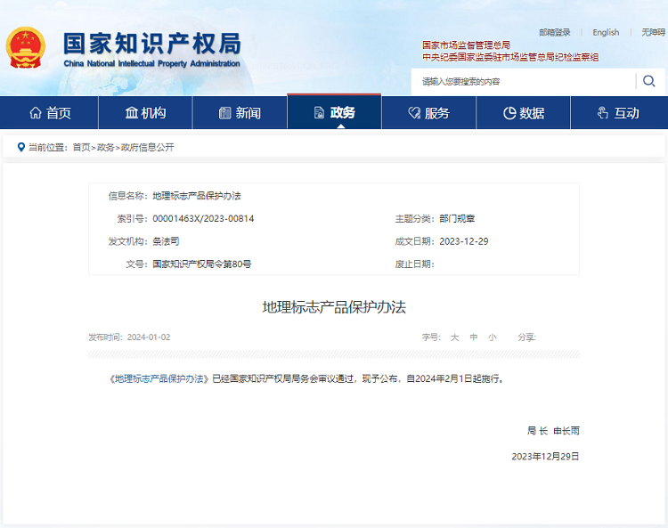 国家知识产权局发布《地理标志产品保护办法》,2月1日起施行!