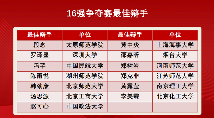 2024年3月30至31日,经过为期两天的激烈角逐,第四届“万慧达杯” 中华商标协会全国高校知识产权(商标)热点问题辩论赛16强赛队产生,他们分别是:宁夏大学法学院、天津工业大学法学院、中央财经大学法学院、湖州师范学院经济管理学院、北京师范大学法学院、中国人民大学法学院、浙江工商大学法学院、上海海事大学法学院、烟台大学法学院、湘潭大学法学学部(对手退赛直接晋级)、华中科技大学法学院、江苏师范大学法学院、安徽大学法学院、北方工业大学文法学院、中国社会科学院大学法学院(首轮轮空直接晋级)、北京工商大学法学院(失利13个赛队中得分最高)。同时,在本轮比赛中也产生了各场次最佳辩手。