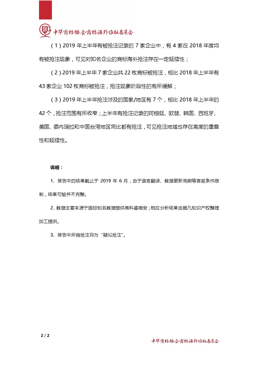 中华商标协会会员企业商标国际抢注预警报告-2019上半年