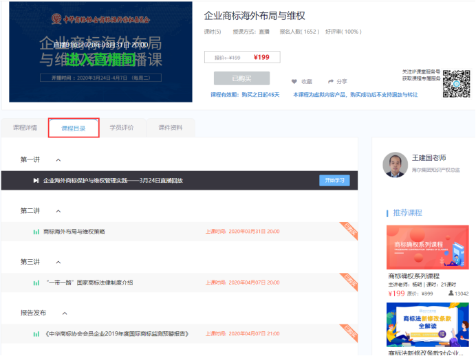 2. 录播与直播的观看页面相同,点击“课程目录”选择相应链接,即可观看课程录播回放;