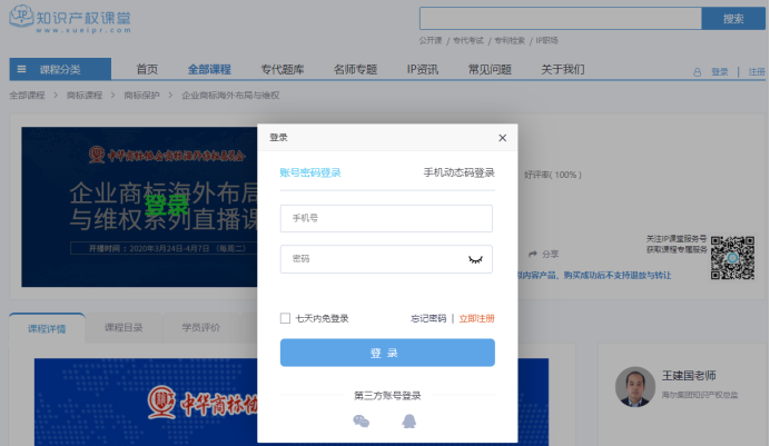 点击课程直播地址(http://www.xueipr.com/course/detail/328703),即可进入直播平台,登陆界面自动弹出。