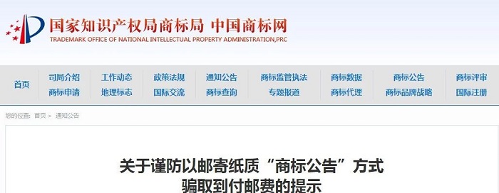 近期我局收到商标申请人反映,有人向申请人寄送纸质“商标公告”,以骗取数额不等的到付邮费。为保护申请人合法权益不受侵害,在此特别提醒,我局2016年5月以后商标公告已采用电子公告的方式,不再对外寄送任何纸质商标公告,我局向申请人寄送的官方书件均不需要申请人支付任何费用,请大家提高警惕,谨防诈骗!